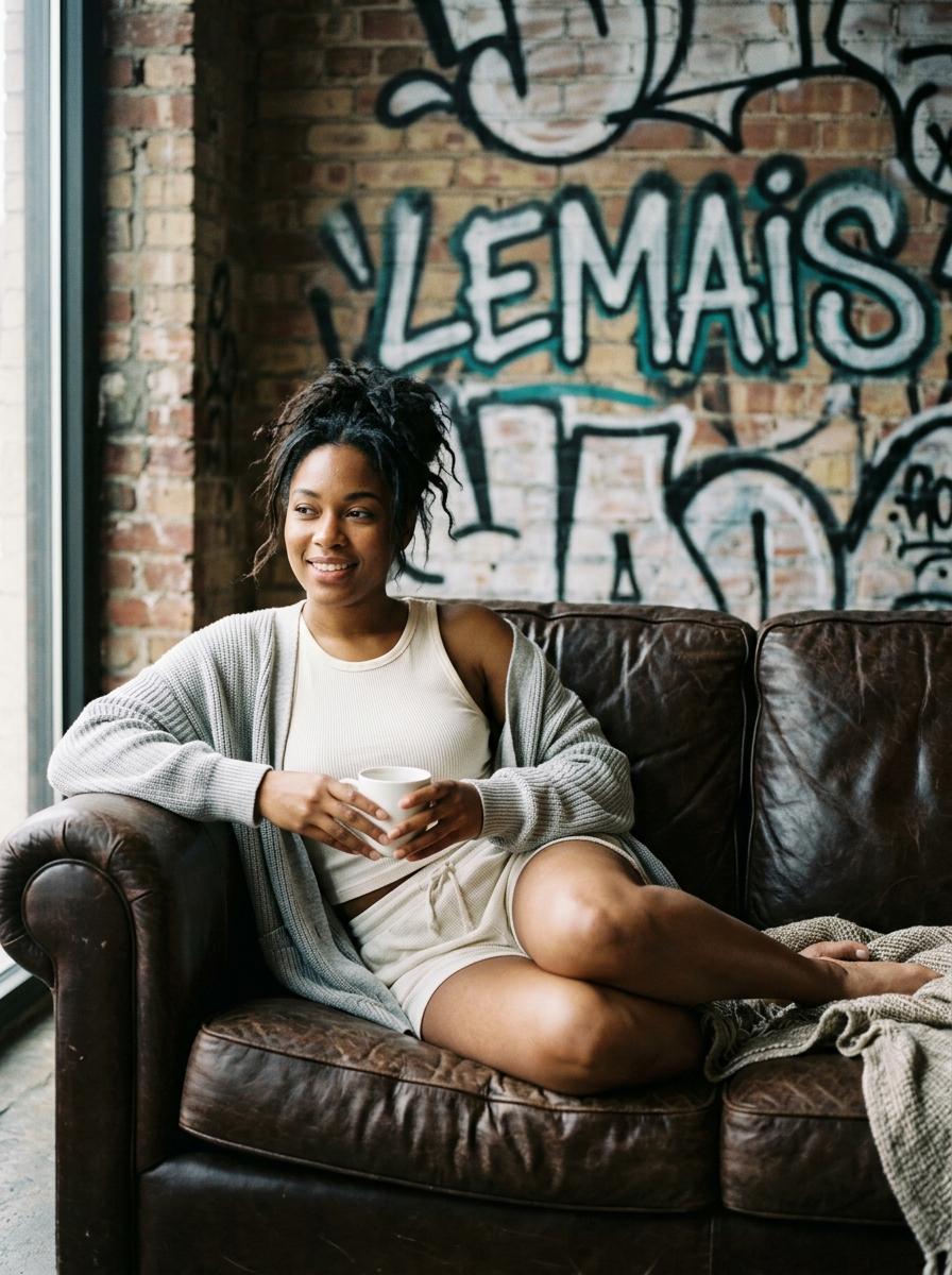 Sultry Victoria's Secret model lounging provocatively on a luxurious brown leather couch against a graffiti wall reading 'lemais', wearing skimpy white lingerie set, legs draped elegantly, soft dramatic lighting, close-up angle, high-glam beauty shot, smoky eyes, tousled hair, sensual confidence., medium