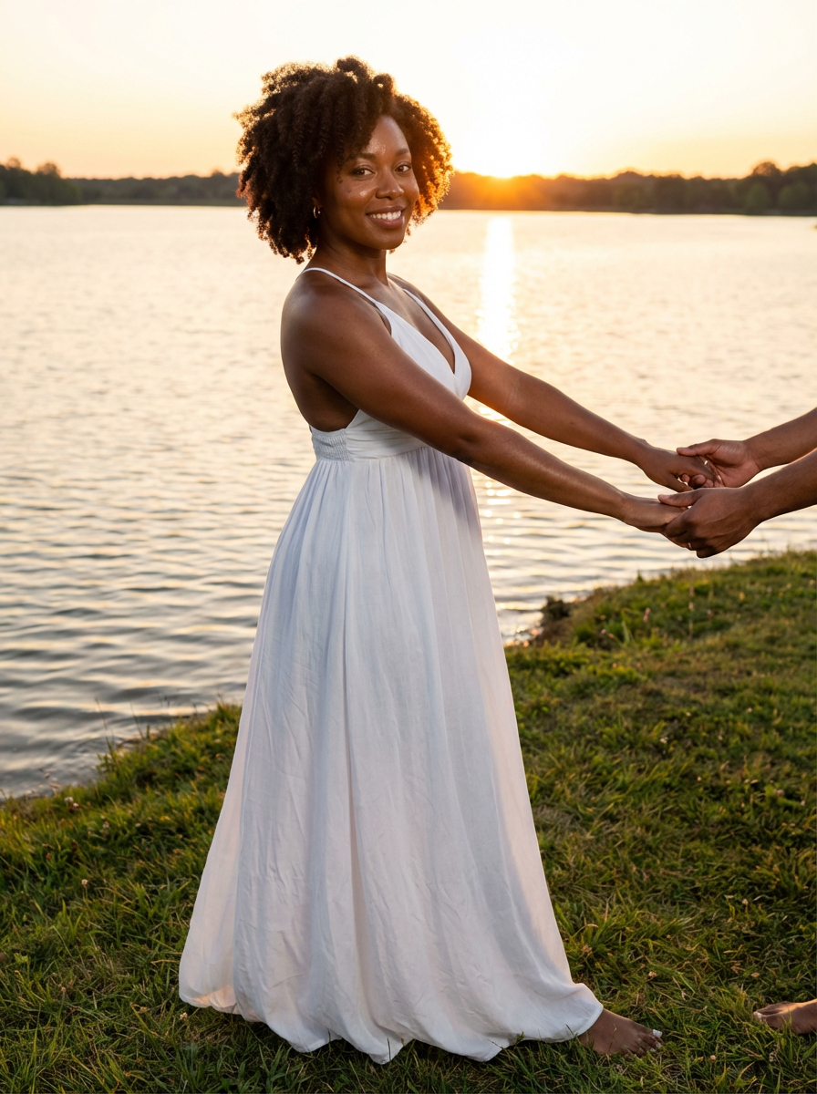 Sunset engagement shoot by a lake. Model wearing a flowy maxi dress . Water reflecting golden hues, serene and romantic atmosphere.