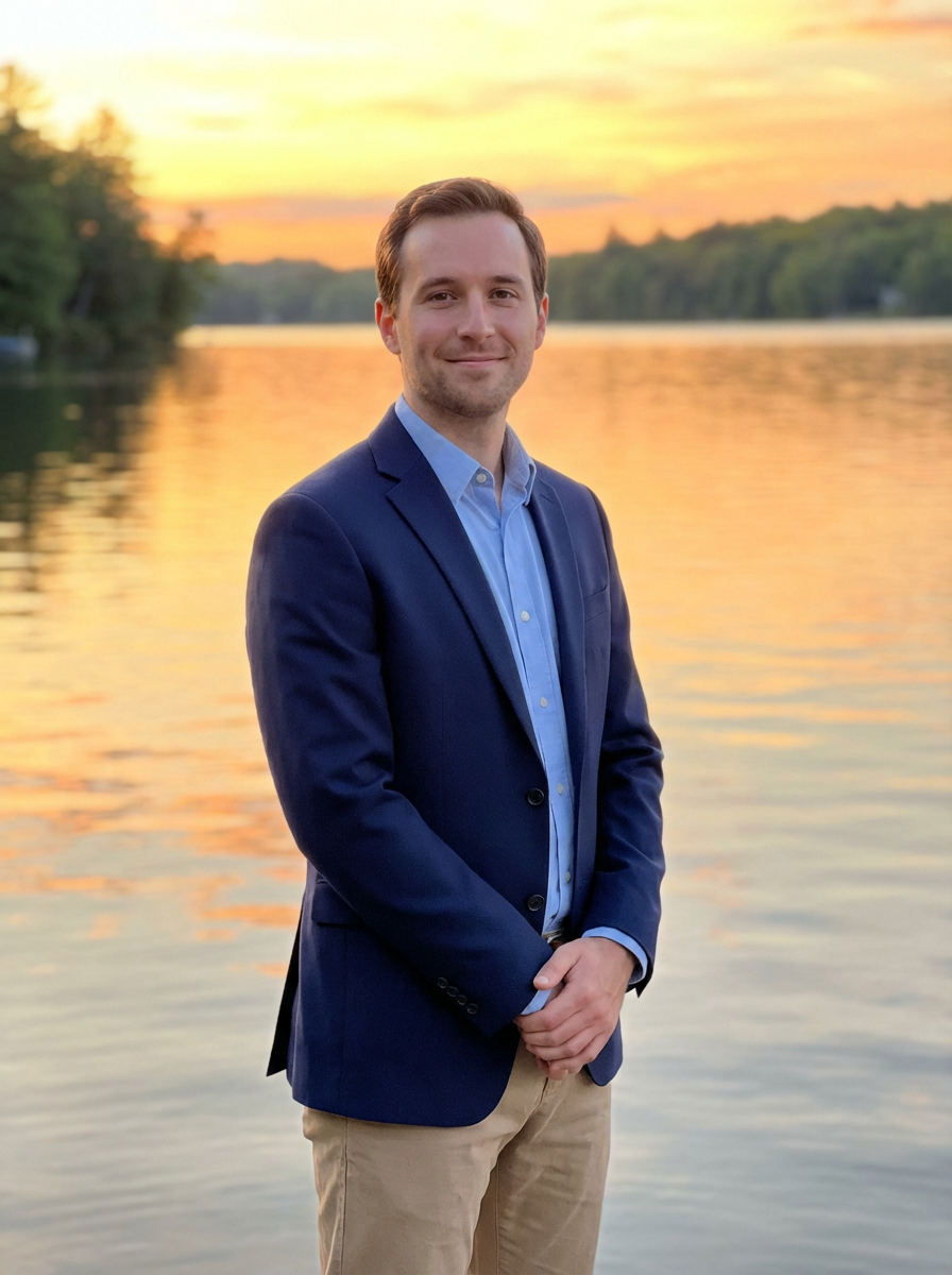 Sunset engagement shoot by a lake. Model wearing a relaxed dress shirt and blazer . Water reflecting golden hues, serene and romantic atmosphere.