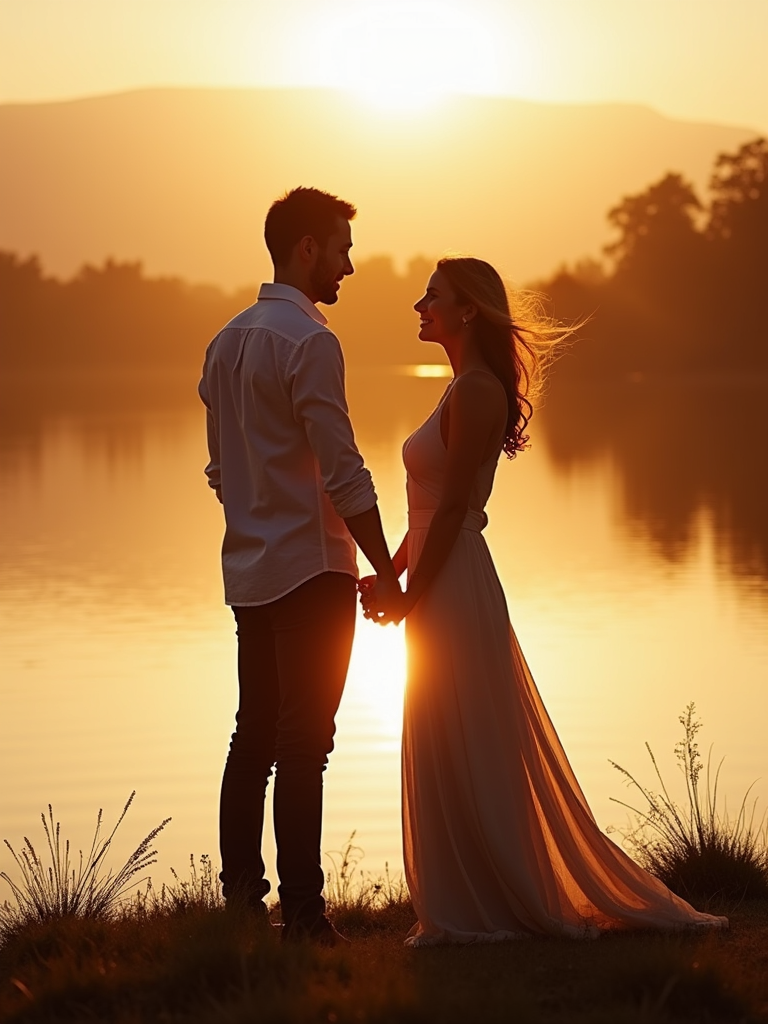 Sunset engagement shoot by a lake. Wearing a flowy maxi dress . Water reflecting golden hues, serene and romantic atmosphere.