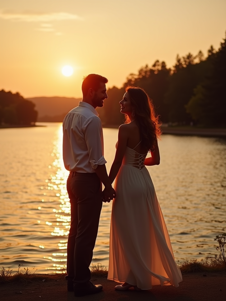 Sunset engagement shoot by a lake. Wearing a flowy maxi dress . Water reflecting golden hues, serene and romantic atmosphere.