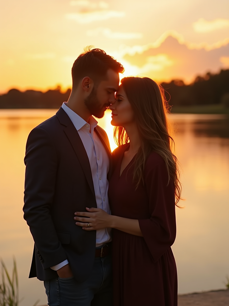 Sunset engagement shoot by a lake. Wearing a relaxed dress shirt and blazer . Water reflecting golden hues, serene and romantic atmosphere.