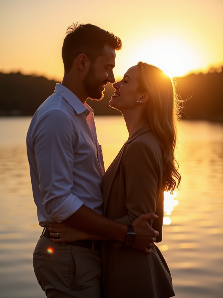 Sunset engagement shoot by a lake. Wearing a relaxed dress shirt and blazer . Water reflecting golden hues, serene and romantic atmosphere.