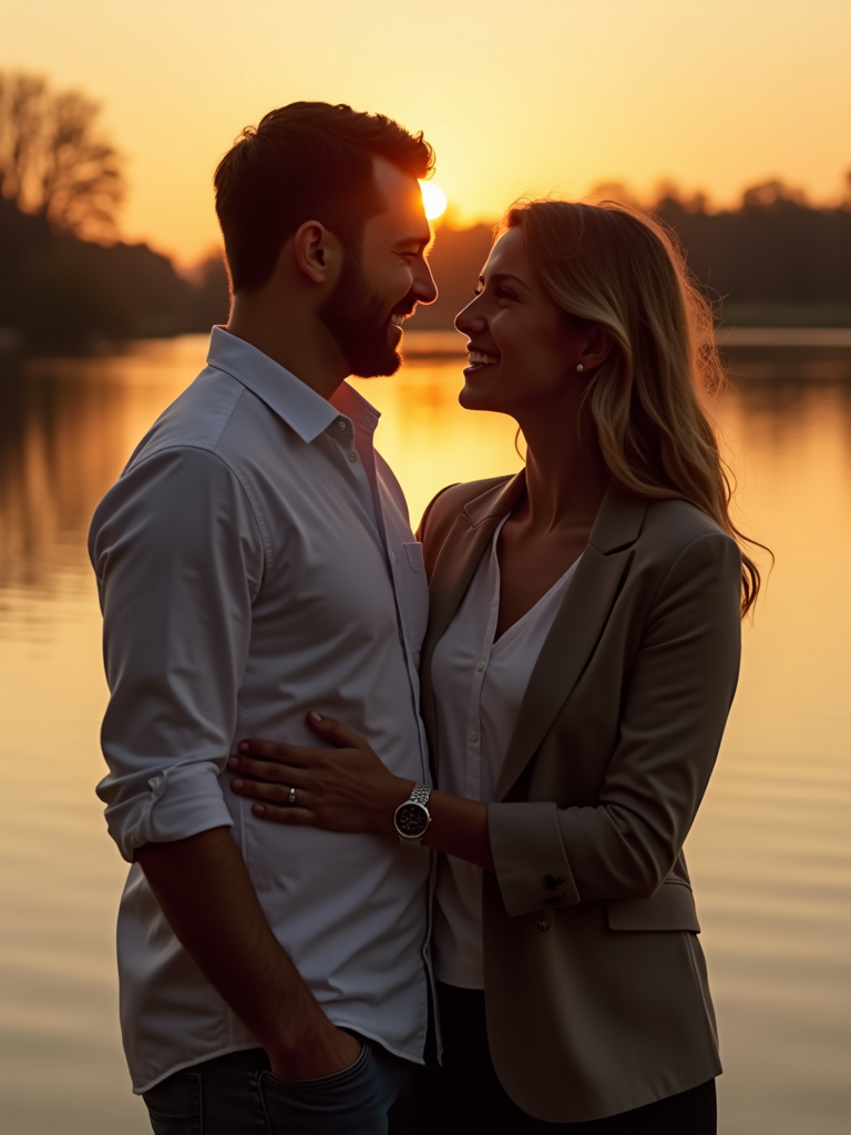 Sunset engagement shoot by a lake. Wearing a relaxed dress shirt and blazer . Water reflecting golden hues, serene and romantic atmosphere.