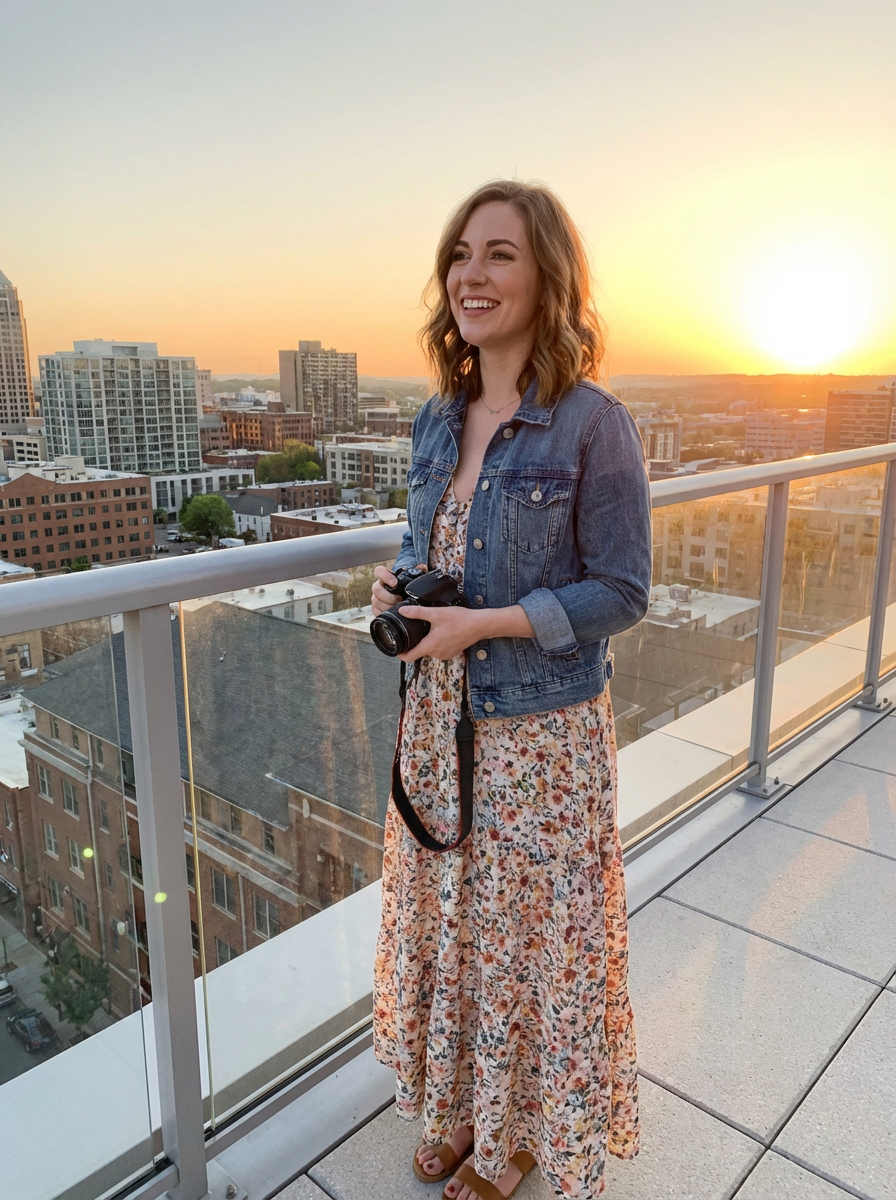 sunset-lover feminine model enjoying a golden-hour skyline