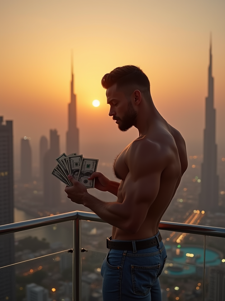 super muscular model counting stacks of cash on a penthouse balcony overlooking Dubai skyline at sunset