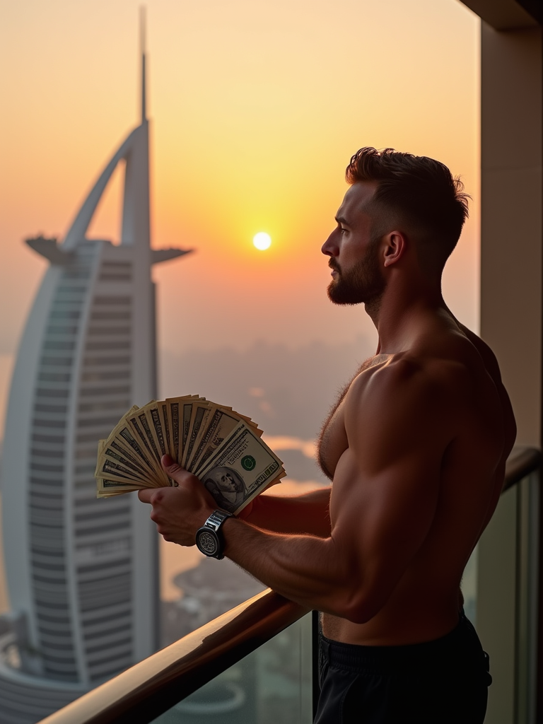 super muscular model counting stacks of cash on a penthouse balcony overlooking Dubai skyline at sunset
