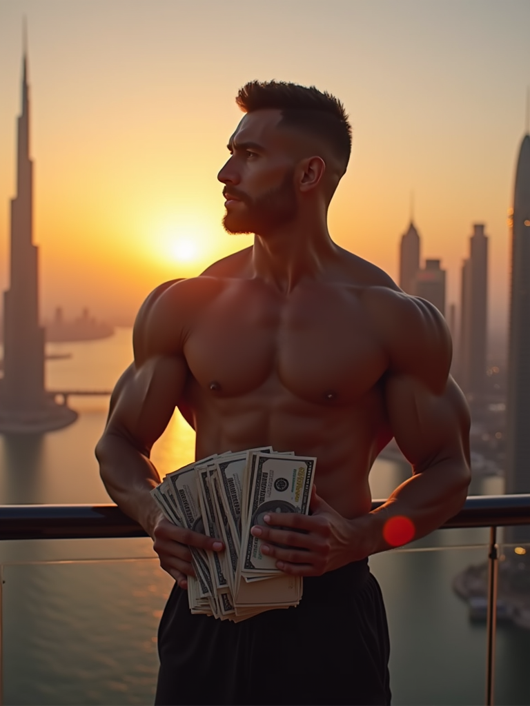 super muscular model counting stacks of cash on a penthouse balcony overlooking Dubai skyline at sunset