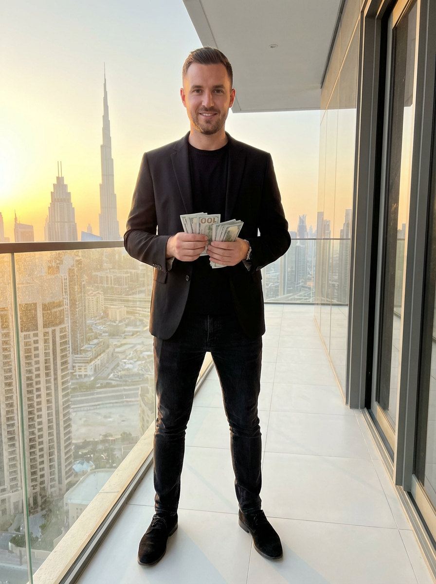 super muscular model counting stacks of cash on a penthouse balcony overlooking Dubai skyline at sunset