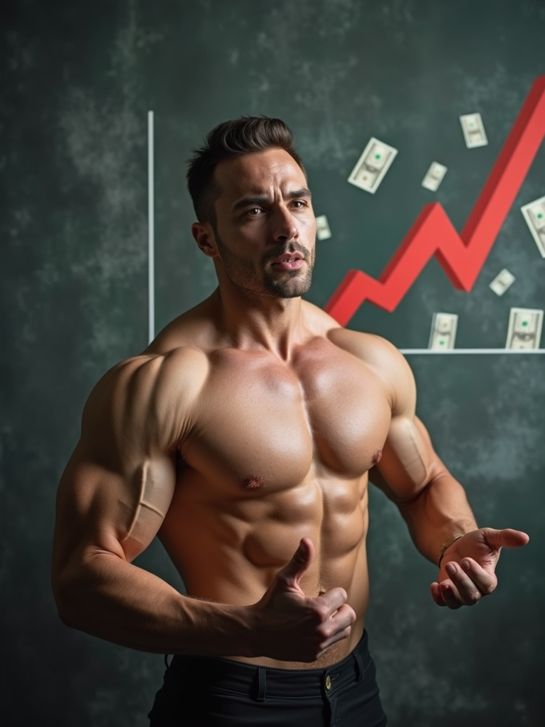 super muscular model doing a presentation showing a chart of money going up