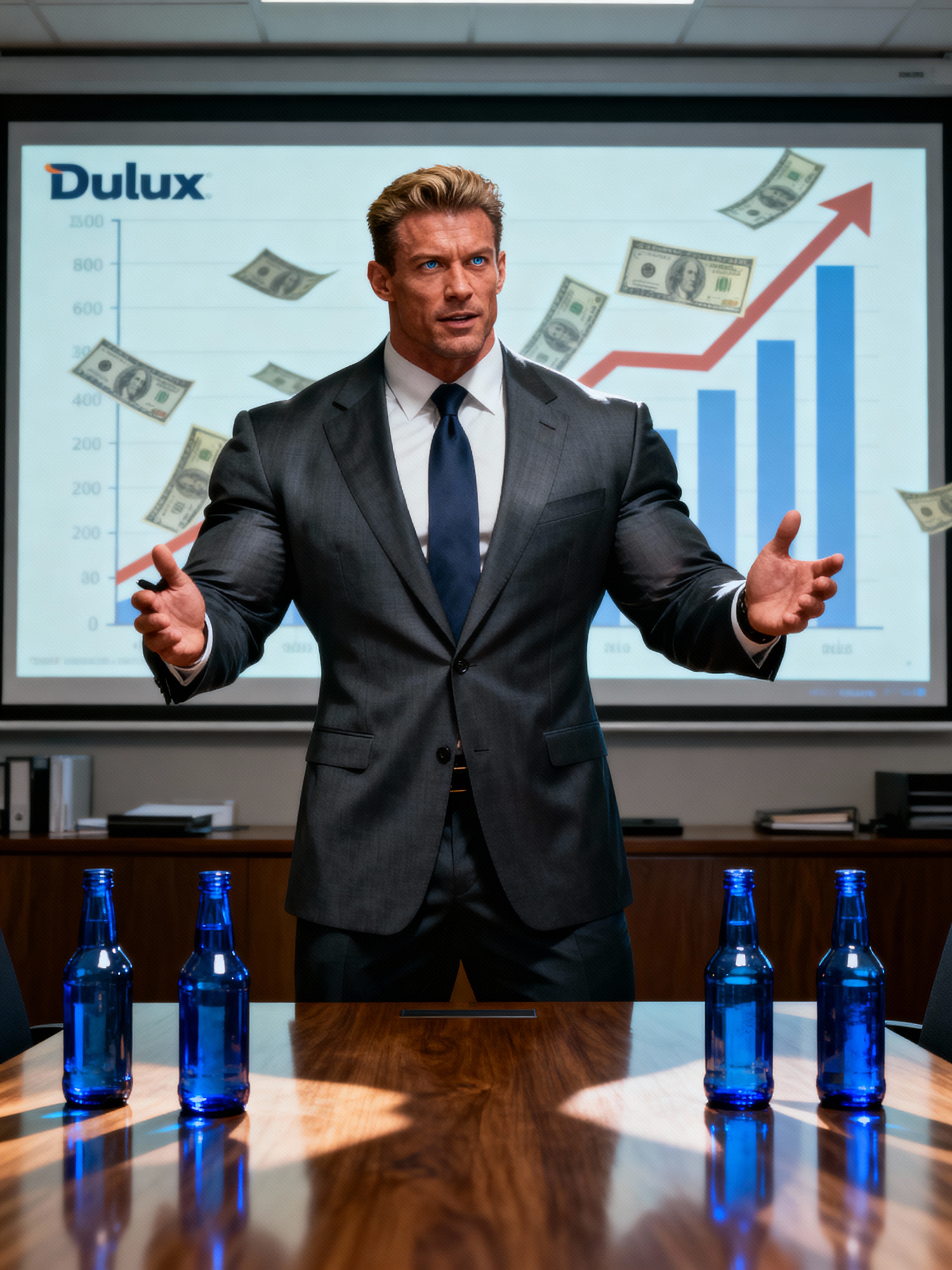 super muscular model doing a presentation showing a chart of money going up, with some solid blue glass bottle on the table