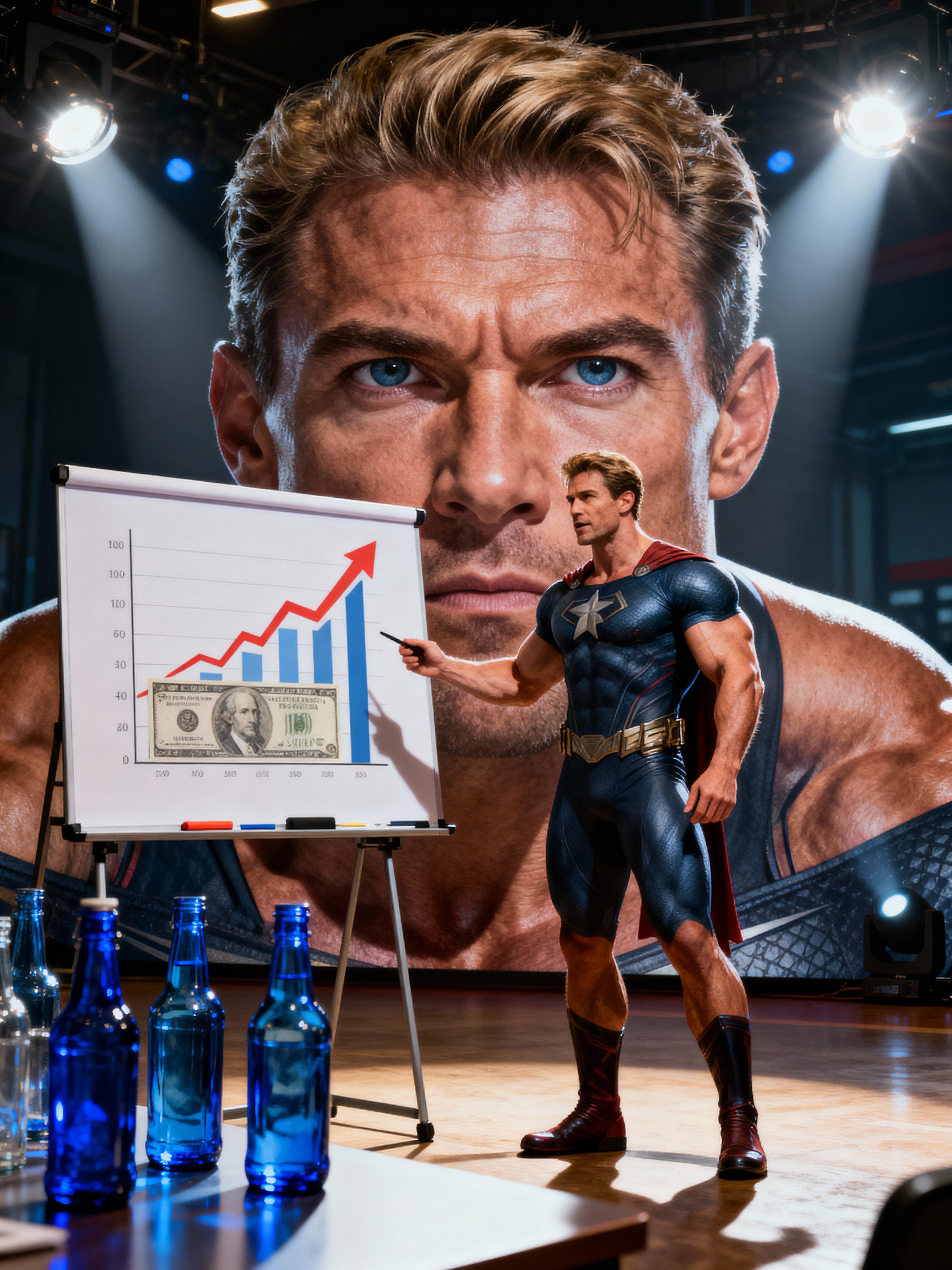 super muscular model doing a presentation showing a chart of money going up, with some solid blue glass bottle on the table