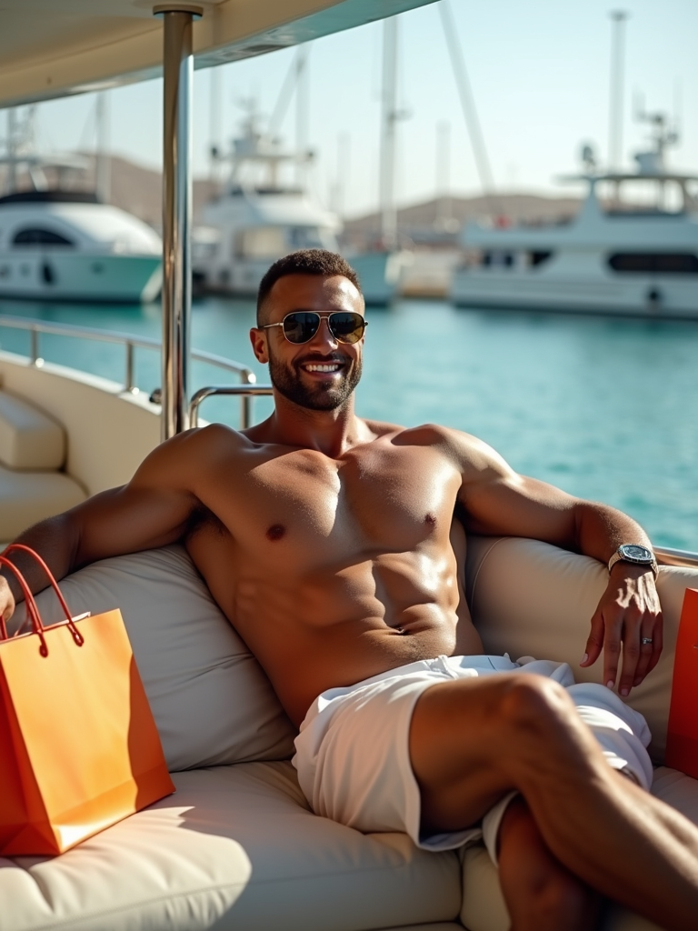 super muscular model lounging on a yacht in Dubai Marina surrounded by shopping bags and luxury watches