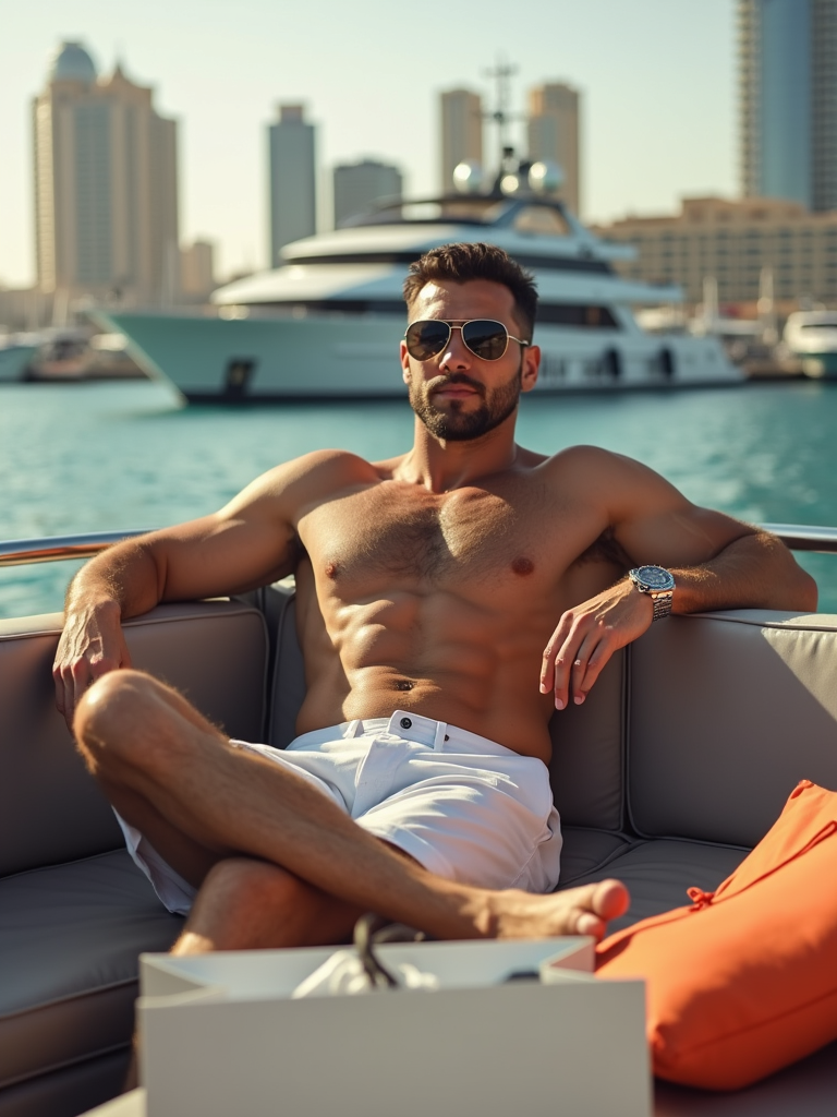 super muscular model lounging on a yacht in Dubai Marina surrounded by shopping bags and luxury watches