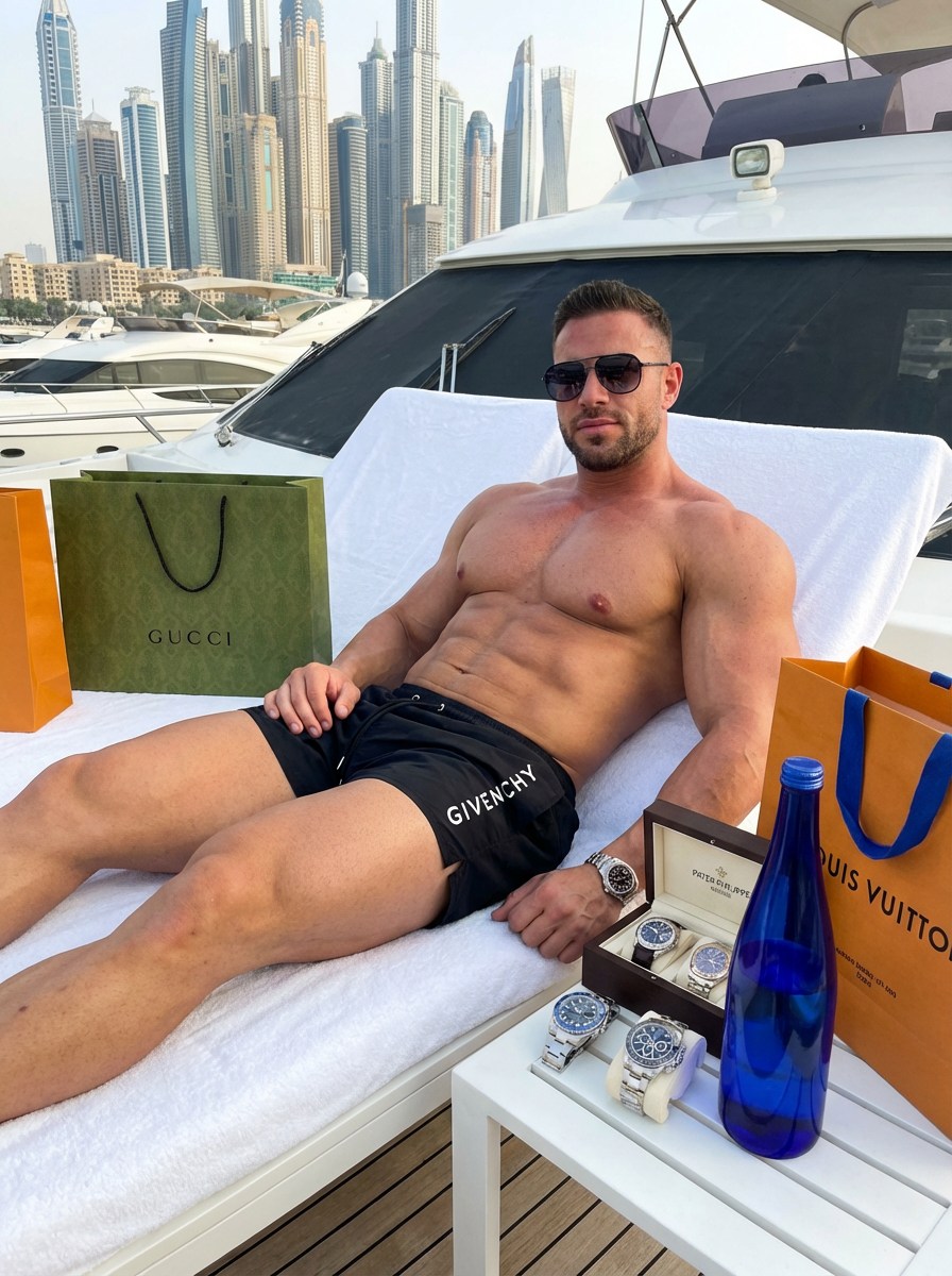 super muscular model lounging on a yacht in Dubai Marina surrounded by shopping bags, luxury watches, and some solid blue glass bottle