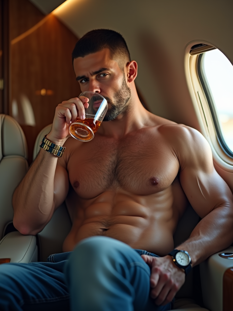super muscular model on a private jet sipping whiskey, showing off a luxury watch and looking serious