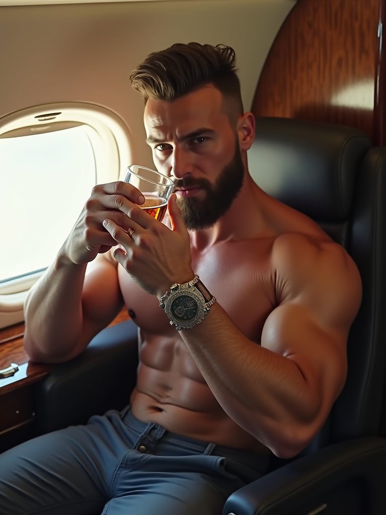 super muscular model on a private jet sipping whiskey, showing off a luxury watch and looking serious
