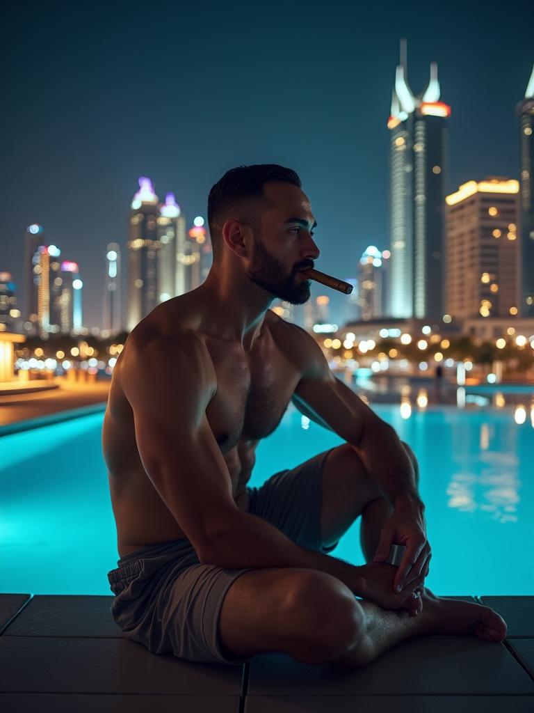 super muscular model sitting by an infinity pool at night in Dubai, smoking a cigar, city skyline behind him