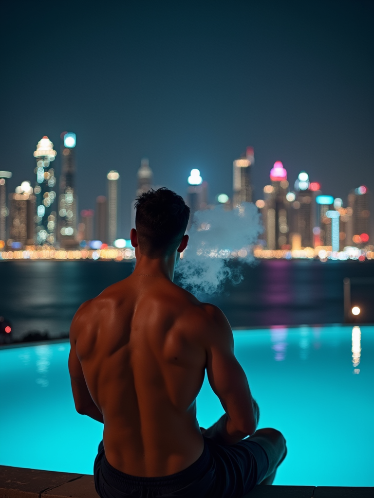 super muscular model sitting by an infinity pool at night in Dubai, smoking a cigar, city skyline behind him