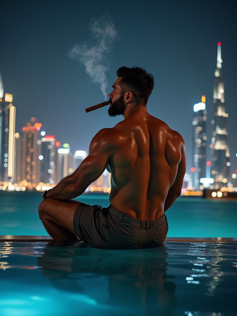 super muscular model sitting by an infinity pool at night in Dubai, smoking a cigar, city skyline behind him