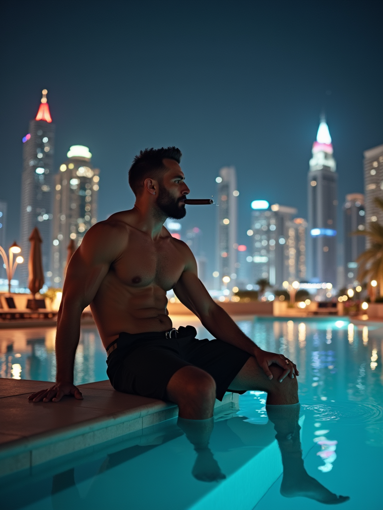 super muscular model sitting by an infinity pool at night in Dubai, smoking a cigar, city skyline behind him