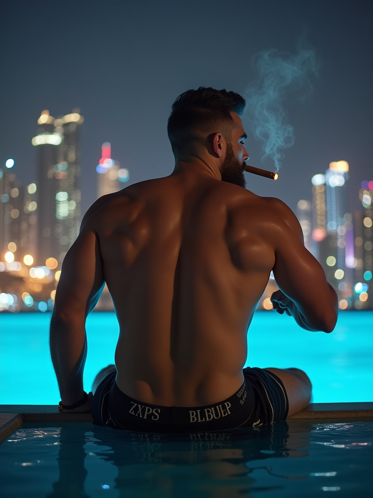 super muscular model sitting by an infinity pool at night in Dubai, smoking a cigar, city skyline behind him