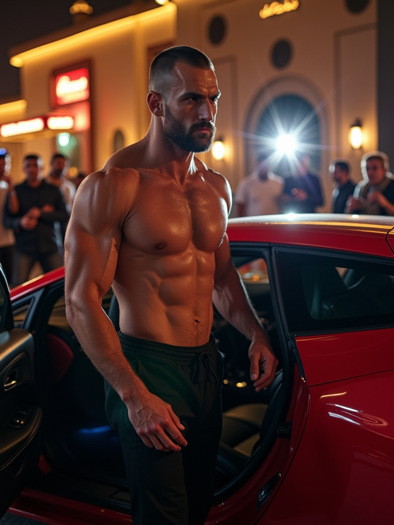 super muscular model stepping out of a Lamborghini at night in front of a Dubai nightclub, paparazzi flashing
