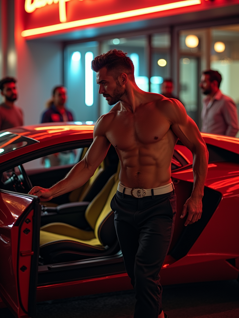 super muscular model stepping out of a Lamborghini at night in front of a Dubai nightclub, paparazzi flashing