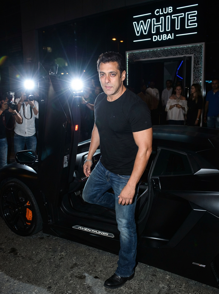 super muscular model stepping out of a Lamborghini at night in front of a Dubai nightclub, paparazzi flashing