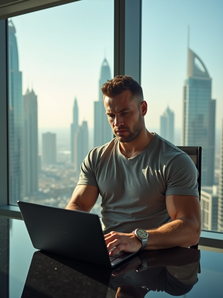 super muscular model trading crypto on a laptop in a skyscraper office overlooking Dubai, wearing designer casual