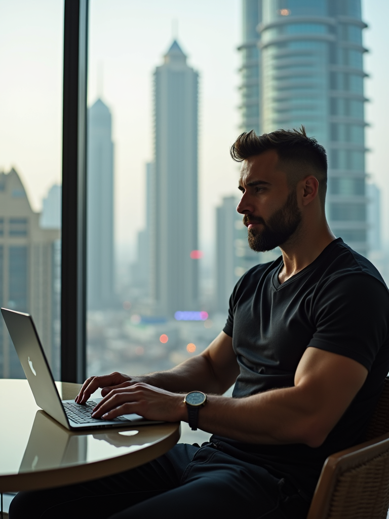super muscular model trading crypto on a laptop in a skyscraper office overlooking Dubai, wearing designer casual