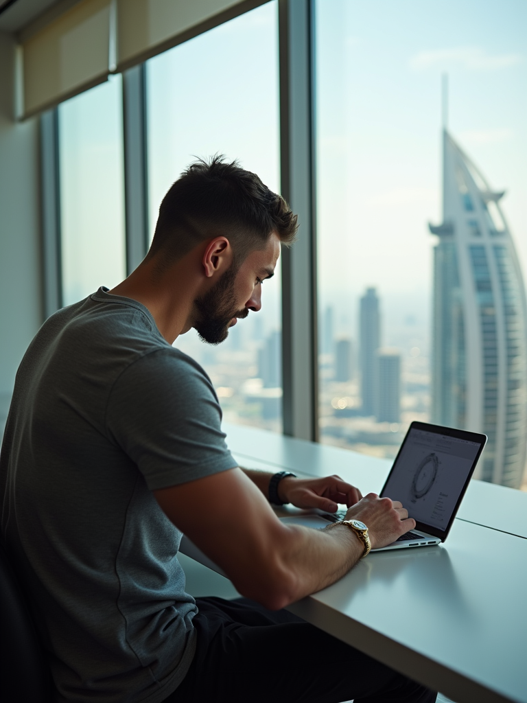 super muscular model trading crypto on a laptop in a skyscraper office overlooking Dubai, wearing designer casual