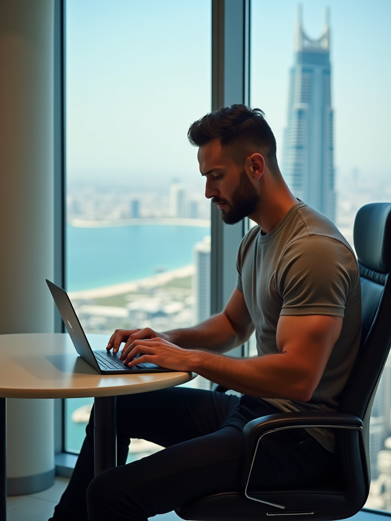 super muscular model trading crypto on a laptop in a skyscraper office overlooking Dubai, wearing designer casual