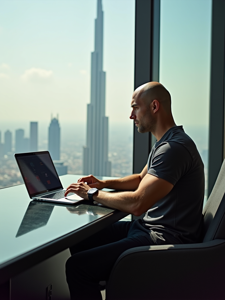 super muscular model trading crypto on a laptop in a skyscraper office overlooking Dubai, wearing designer casual