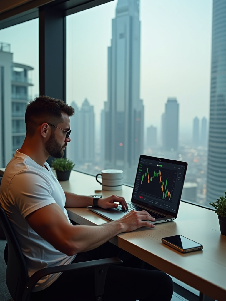super muscular model trading crypto on a laptop in a skyscraper office overlooking Dubai, wearing designer casual