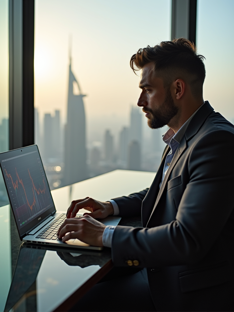 super muscular model trading crypto on a laptop in a skyscraper office overlooking Dubai, wearing designer casual