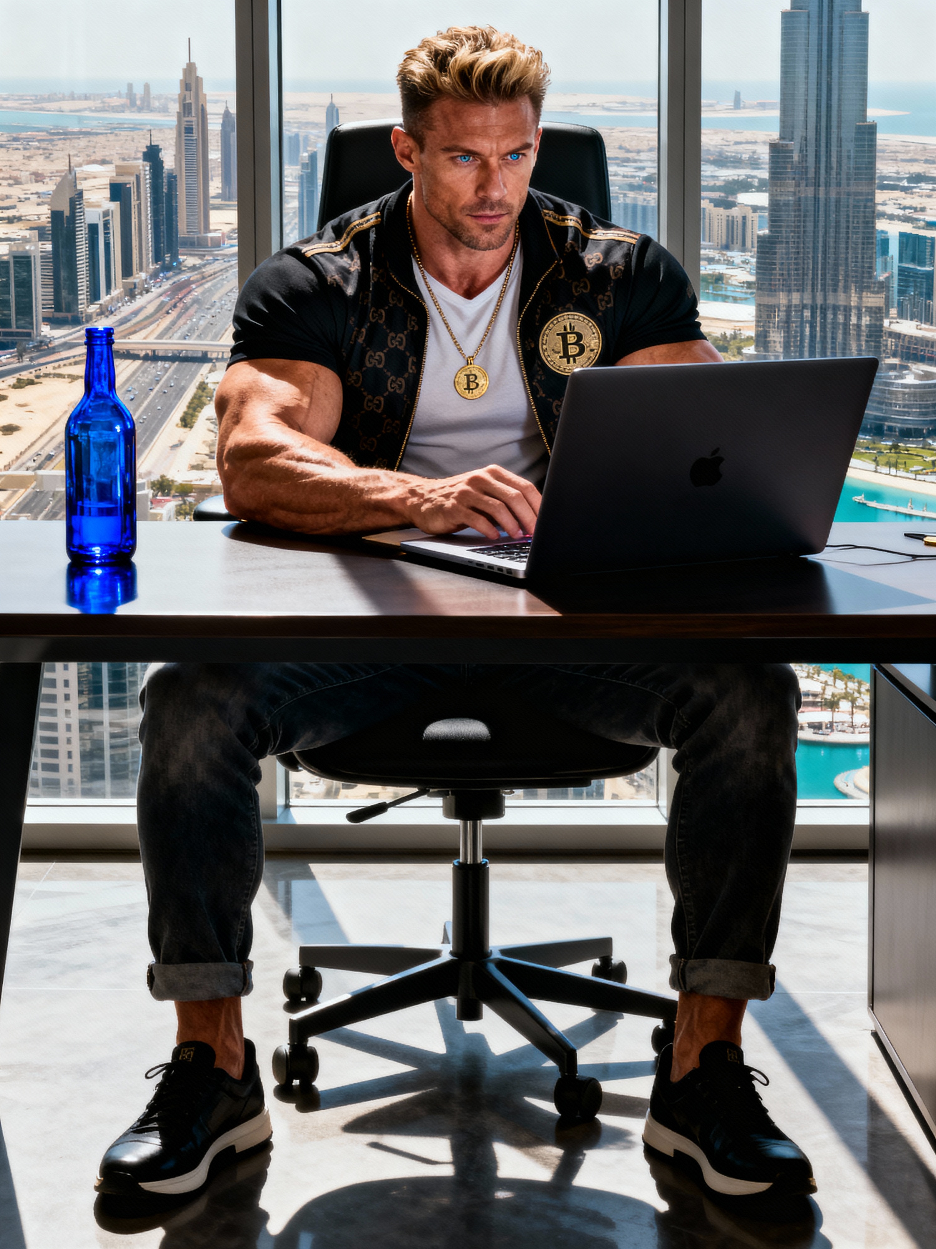 super muscular model trading crypto on a laptop in a skyscraper office overlooking Dubai, wearing designer casual, with some solid blue glass bottle on the desk