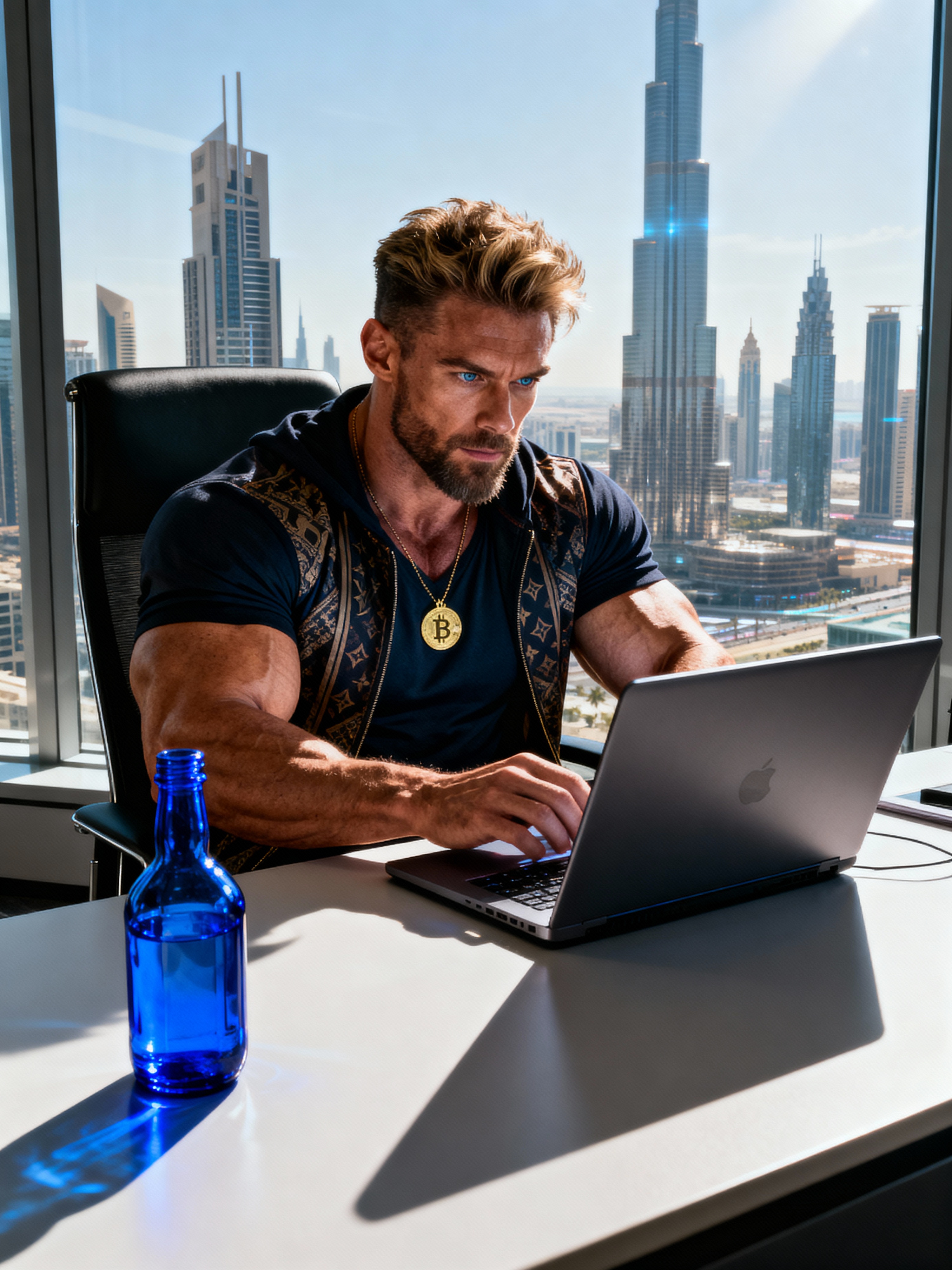 super muscular model trading crypto on a laptop in a skyscraper office overlooking Dubai, wearing designer casual, with some solid blue glass bottle on the desk