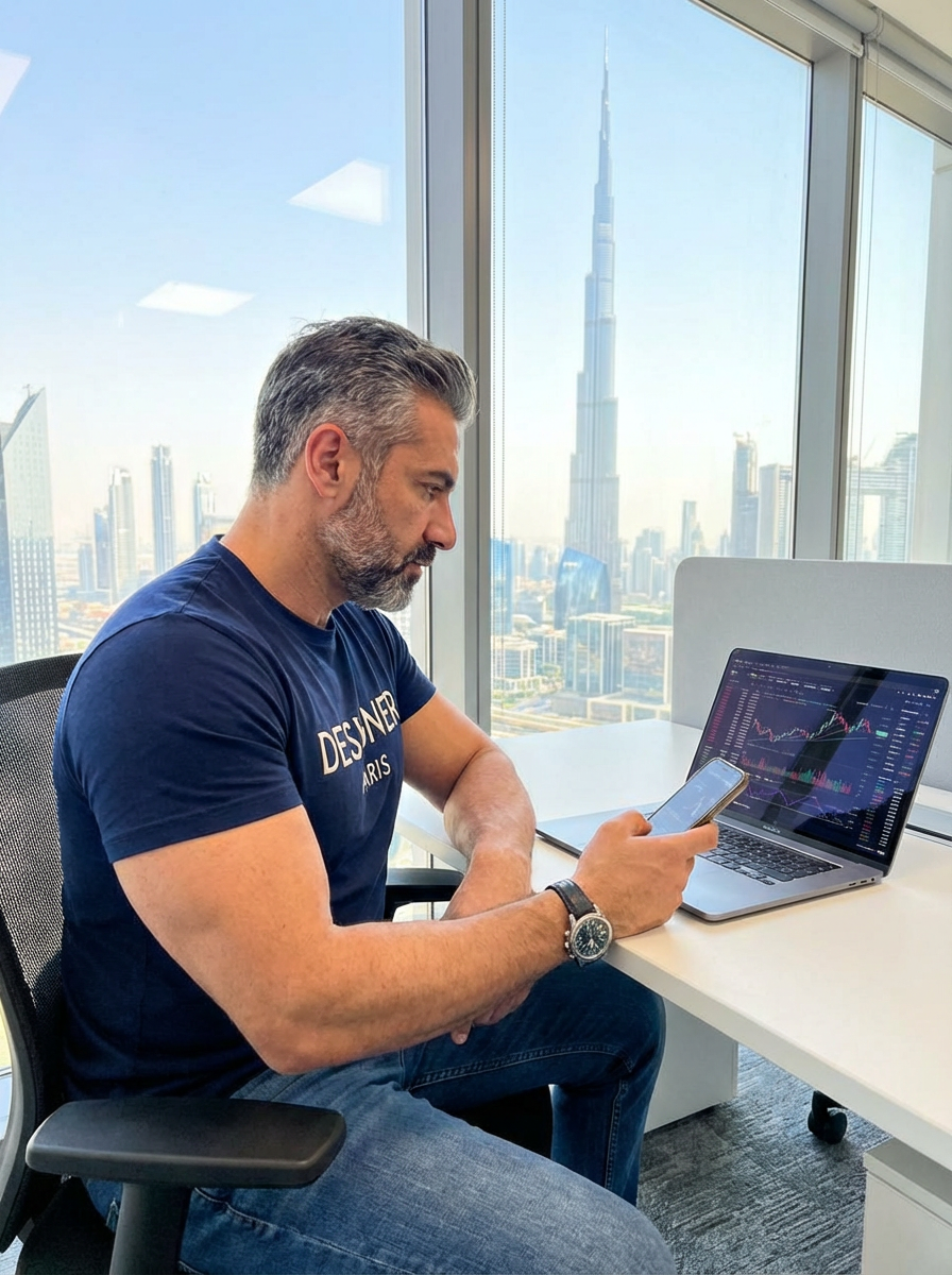 super muscular model trading crypto on a laptop in a skyscraper office overlooking Dubai, wearing designer casual