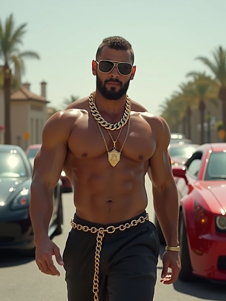 super muscular model wearing gold chains and sunglasses walking past luxury cars in slow motion