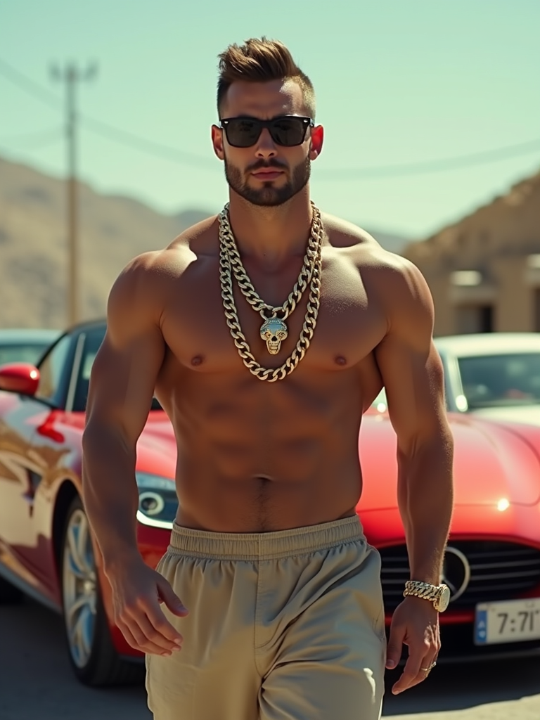 super muscular model wearing gold chains and sunglasses walking past luxury cars in slow motion