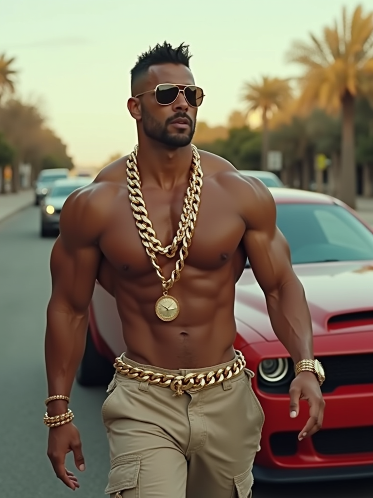 super muscular model wearing gold chains and sunglasses walking past luxury cars in slow motion