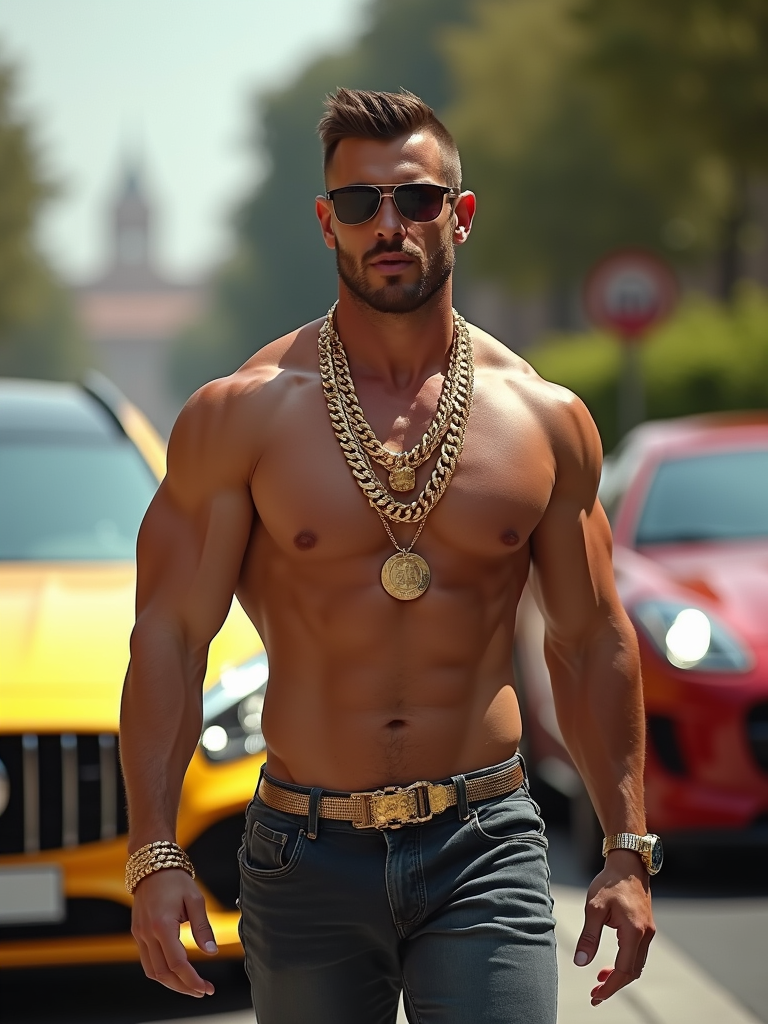 super muscular model wearing gold chains and sunglasses walking past luxury cars in slow motion