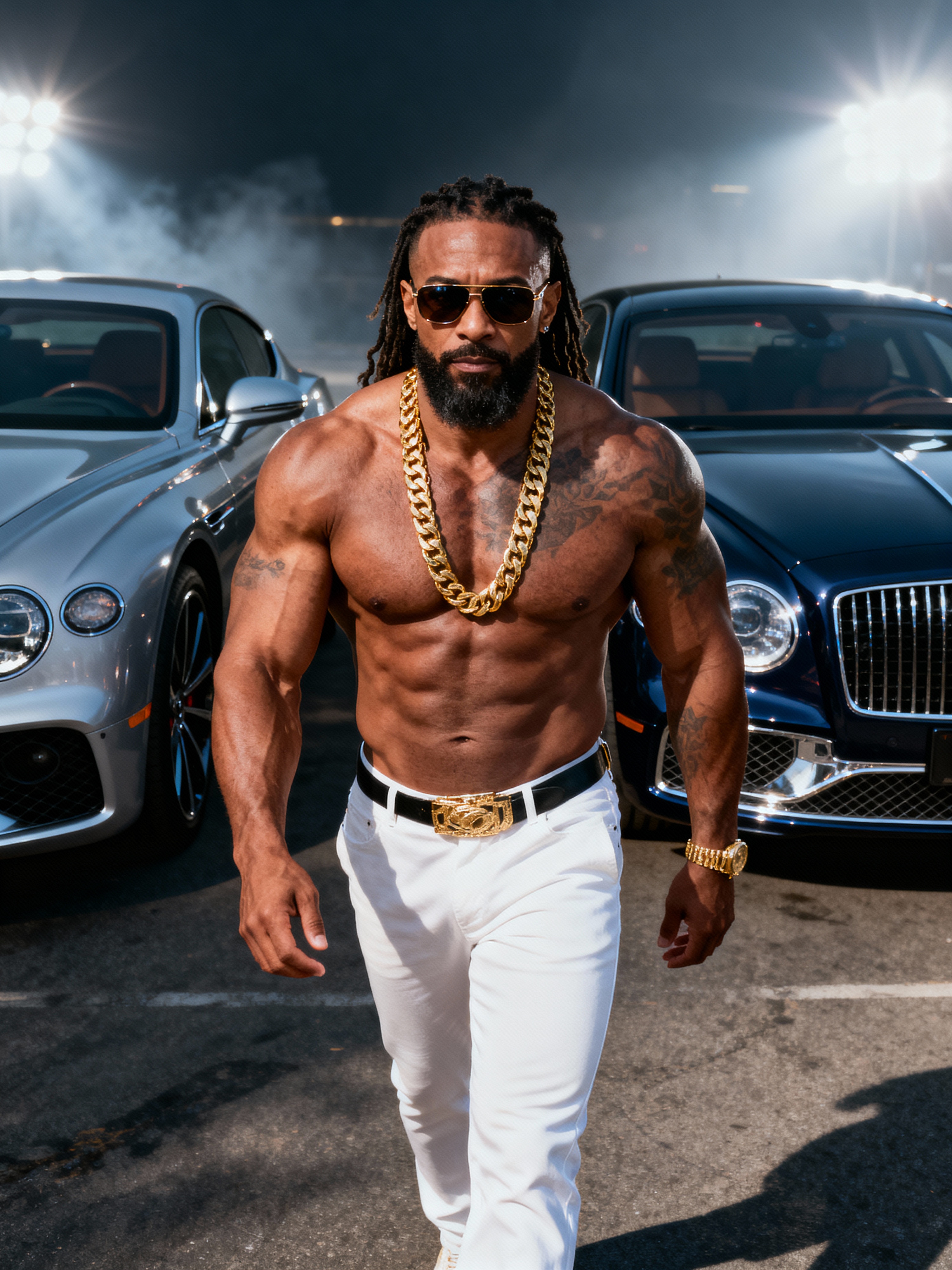 super muscular model wearing gold chains and sunglasses walking past luxury cars in slow motion