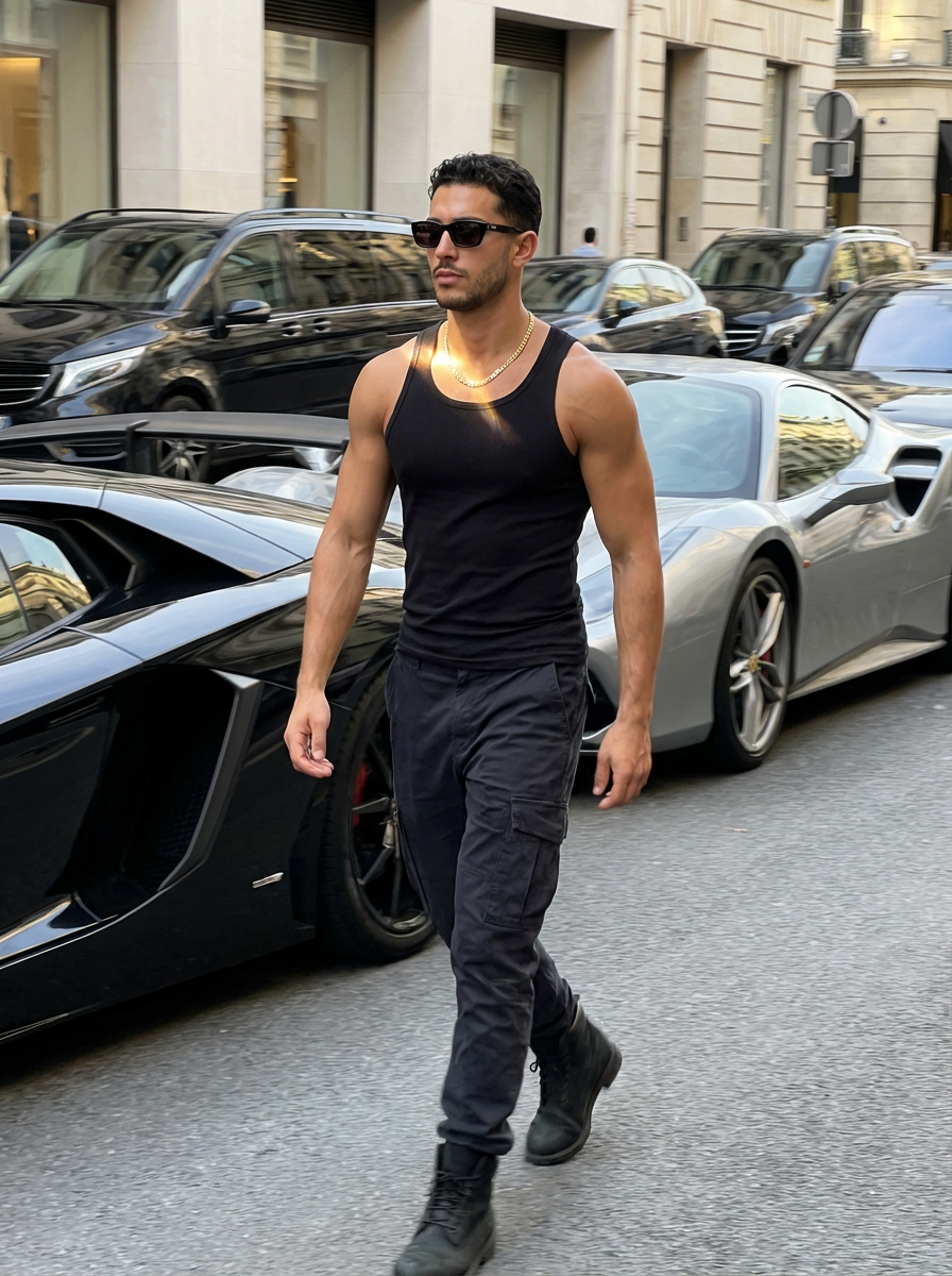 super muscular model wearing gold chains and sunglasses walking past luxury cars in slow motion