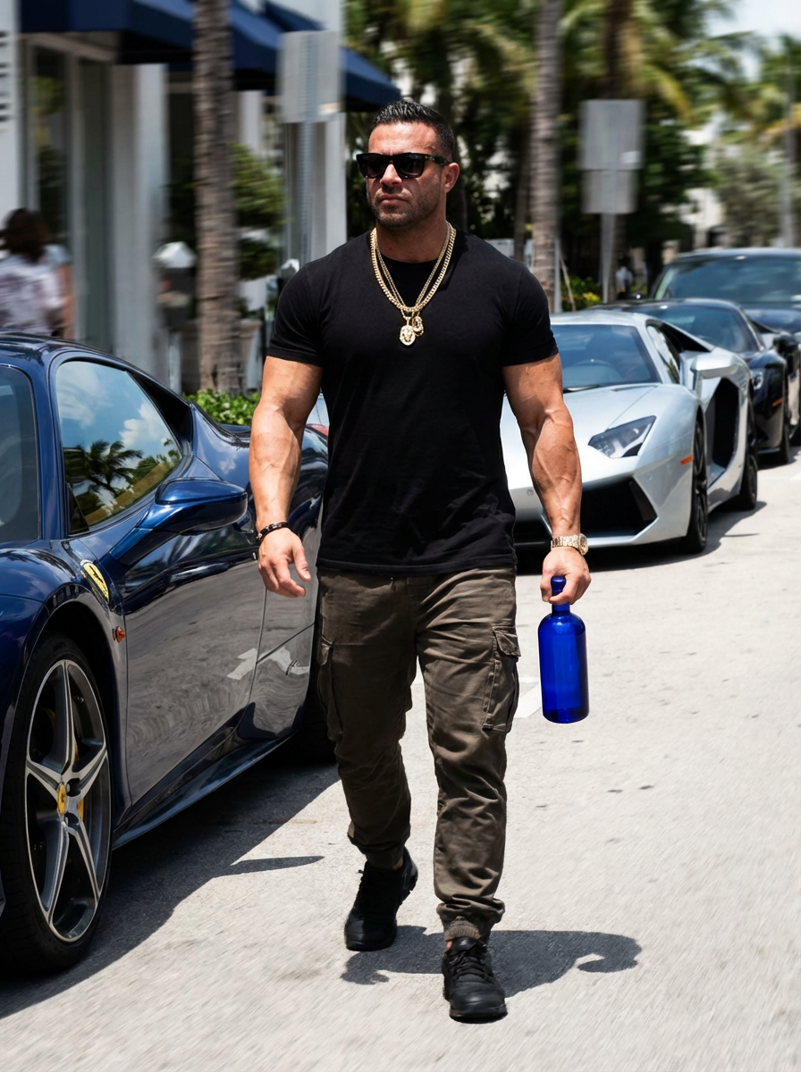 super muscular model wearing gold chains and sunglasses walking past luxury cars in slow motion, with some solid blue glass bottle in the scene