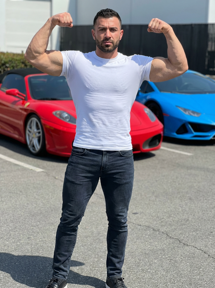 super muscular model with a tight fitting white shirt posing in front of sports cars
