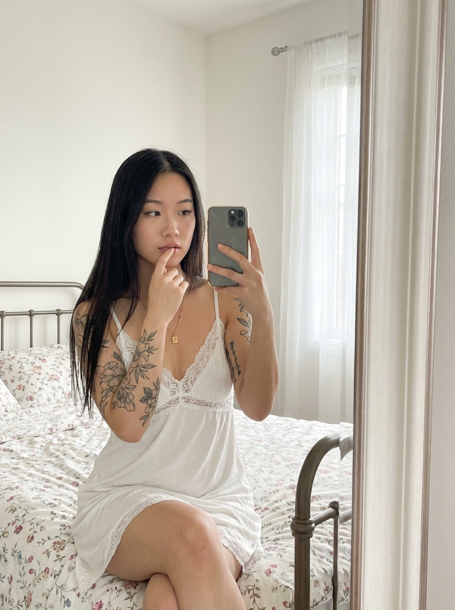 {"system_directives": {"task": "High-Fidelity Image Synthesis", "version": "v2.1", "aspect_ratio": "3:4", "style": "Ultra-Photorealistic", "fidelity_focus": "Skin texture, fabric behavior, realistic light falloff"}, "subject_profile": {"demographics": {"gender": "model", "age": "25-year-old ", "skin": ", natural pores and fine texture"}, "anatomy_and_physique": {"build": "Slim-average with an accentuated, voluminous bust ", "facial_expression": "Soft, contemplative, relaxed, looking into mirror", "hair": {hair, "style": "Long, straight, sleek, center-parted"}, "tattoos": ["Illustrative floral sleeves on both arms", "Small minimalist tattoo on upper thigh"]}, "facial_features": {"eyes": "Introspective gaze", "lips": "One hand gently touching lips, soft-parted", "makeup": "Minimalist, 'no-makeup' look, natural finish"}}, "composition_and_pose": {"perspective": "Mirror selfie perspective", "physical_pose": "Seated on bed, legs bent and drawn close to chest", "interaction": "Holding smartphone in front of face to capture reflection", "framing": "Upper body and partial legs visible in mirror frame"}, "wardrobe_and_styling": {"apparel": {"type": "Lounge dress / sleepwear", "color": "Pristine white", "material": "Semi-sheer soft fabric, delicate lace trim", "cut": "Thin spaghetti straps, form-fitting silhouette"}, "accessories": {"jewelry": ["Simple gold necklace", "Small if(gender=f){hoop earrings } "], "nails": "Natural, neatly manicured"}}, "environment_and_setting": {"location": "Bright, airy bedroom", "background_elements": {"bed": "metal-frame bed, floral-patterned bedding", "decor": ["Small potted plants", "Subtle floral accents", "Minimalist furniture"], "windows": "Large window, sheer curtains, diffused daylight"}, "color_palette": {"primary": ["Soft whites", "Creams", "Light neutrals"], "accents": ["Muted floral tones", "Natural greens"]}}, "lighting_and_mood": {"lighting": {"source": "Side-lit from window", "quality": "Soft, diffused natural daylight", "shadows": "Gentle, minimal, contour -enhancing"}, "mood": {"emotional_tone": "Serene, intimate, cozy, introspective", "visual_feel": "Aesthetically soft, cinematic lifestyle"}}, "technical_specifications": {"camera_simulation": {"device": "High-end smartphone camera sensor", "lens_profile": "Wide-angle (24mm equivalent)", "optics": "Shallow depth of field (f/1.8 simulation)"}, "post_processing": {"color_grading": "Natural, soft contrast, gentle highlights", "cleanliness": "Zero noise, crisp edge definition, no artifacts"}}, "negative_constraints": {"artifacts": ["Extra fingers", "Blurred face", "Anatomical distortion", "Low resolution"], "styling_errors": ["Heavy makeup", "Cartoonish hair", "Plastic skin", "Harsh shadows"], "content_errors": ["Text", "Watermarks", "Logos", "Messy background"]}}