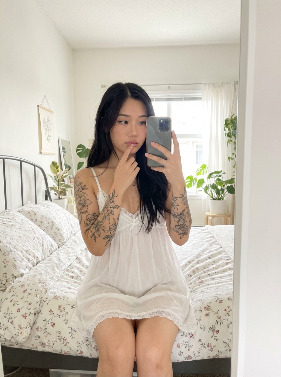 {"system_directives": {"task": "High-Fidelity Image Synthesis", "version": "v2.1", "aspect_ratio": "3:4", "style": "Ultra-Photorealistic", "fidelity_focus": "Skin texture, fabric behavior, realistic light falloff"}, "subject_profile": {"demographics": {"gender": "model", "age": "25-year-old ", "skin": ", natural pores and fine texture"}, "anatomy_and_physique": {"build": "Slim-average with an accentuated, voluminous bust ", "facial_expression": "Soft, contemplative, relaxed, looking into mirror", "hair": {hair, "style": "Long, straight, sleek, center-parted"}, "tattoos": ["Illustrative floral sleeves on both arms", "Small minimalist tattoo on upper thigh"]}, "facial_features": {"eyes": "Introspective gaze", "lips": "One hand gently touching lips, soft-parted", "makeup": "Minimalist, 'no-makeup' look, natural finish"}}, "composition_and_pose": {"perspective": "Mirror selfie perspective", "physical_pose": "Seated on bed, legs bent and drawn close to chest", "interaction": "Holding smartphone in front of face to capture reflection", "framing": "Upper body and partial legs visible in mirror frame"}, "wardrobe_and_styling": {"apparel": {"type": "Lounge dress / sleepwear", "color": "Pristine white", "material": "Semi-sheer soft fabric, delicate lace trim", "cut": "Thin spaghetti straps, form-fitting silhouette"}, "accessories": {"jewelry": ["Simple gold necklace", "Small if(gender=f){hoop earrings } "], "nails": "Natural, neatly manicured"}}, "environment_and_setting": {"location": "Bright, airy bedroom", "background_elements": {"bed": "metal-frame bed, floral-patterned bedding", "decor": ["Small potted plants", "Subtle floral accents", "Minimalist furniture"], "windows": "Large window, sheer curtains, diffused daylight"}, "color_palette": {"primary": ["Soft whites", "Creams", "Light neutrals"], "accents": ["Muted floral tones", "Natural greens"]}}, "lighting_and_mood": {"lighting": {"source": "Side-lit from window", "quality": "Soft, diffused natural daylight", "shadows": "Gentle, minimal, contour -enhancing"}, "mood": {"emotional_tone": "Serene, intimate, cozy, introspective", "visual_feel": "Aesthetically soft, cinematic lifestyle"}}, "technical_specifications": {"camera_simulation": {"device": "High-end smartphone camera sensor", "lens_profile": "Wide-angle (24mm equivalent)", "optics": "Shallow depth of field (f/1.8 simulation)"}, "post_processing": {"color_grading": "Natural, soft contrast, gentle highlights", "cleanliness": "Zero noise, crisp edge definition, no artifacts"}}, "negative_constraints": {"artifacts": ["Extra fingers", "Blurred face", "Anatomical distortion", "Low resolution"], "styling_errors": ["Heavy makeup", "Cartoonish hair", "Plastic skin", "Harsh shadows"], "content_errors": ["Text", "Watermarks", "Logos", "Messy background"]}}