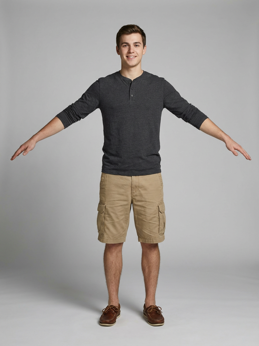 T-pose reference model, front view perspective, arms extended at shoulder height, full body shot, wearing henley shirt, shorts, boat shoes, ideal for 3D character maning workflow